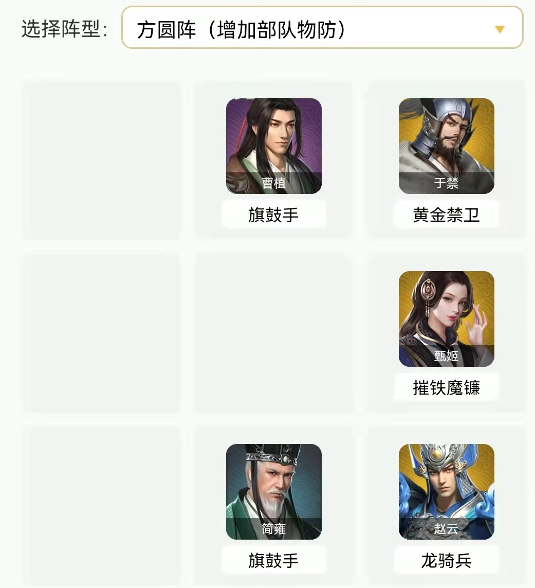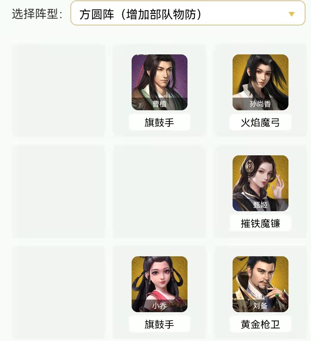 前排:治疗武将(姜维、甄姬、蔡文姬)、输出武将(郭嘉、孙尚香、徐盛、张飞等等)、辅助武将曹操。