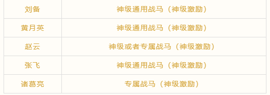 这个配置,诸葛亮进场士气65点(5个神级激励25点,专属战马40点),四将进场士气25点。其中黄月英可以替换为蜀国任意鼓将,赵云可以替换成其他蜀国输出(全体输出最好,由于目前蜀国全体输出武将未全部开放,暂时用赵云替代)。