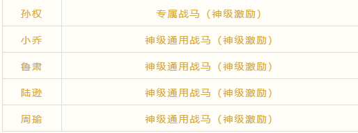 这个配置,全军5个武将进场士气35点(5个神级激励25点,孙权专属战马10点)。其中孙权、小乔、鲁肃可以替换为任意鼓将,但如果孙权被替换,那么全体武将进场士气就只有25点了,如果替换成其他国家的鼓将,队伍就少一点国家加成。