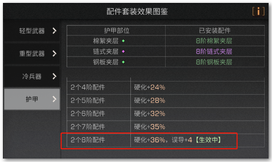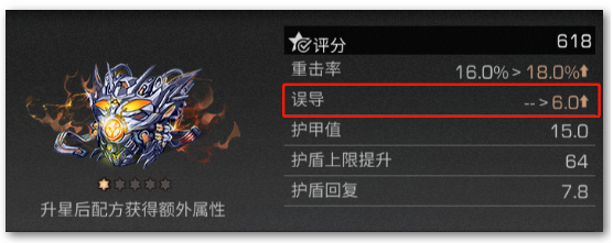 (涂装的误导值在对应护甲的基础上提升2点误导值,典藏涂装的误导值在对应护甲的基础上提升4点误导值,配方专研星级达一星提升8点误导值。)