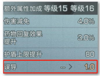 2、当护盾的配方专研等级在16-19级和36-39级时,每升一级可获得一点误导值,共可获得8点误导值,即当护盾的配方专研等级达到39级时一共可获得14点误导值。