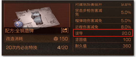 1、盾牌的误导值通过配方改造最高可获得20点,通过配方专研最高可获得8点即一共可获得28点。