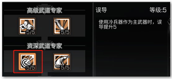 当武士等级达到资深武道专家时可提升误导技能,即使用冷兵器作为主武器时误导值最高提升5点。