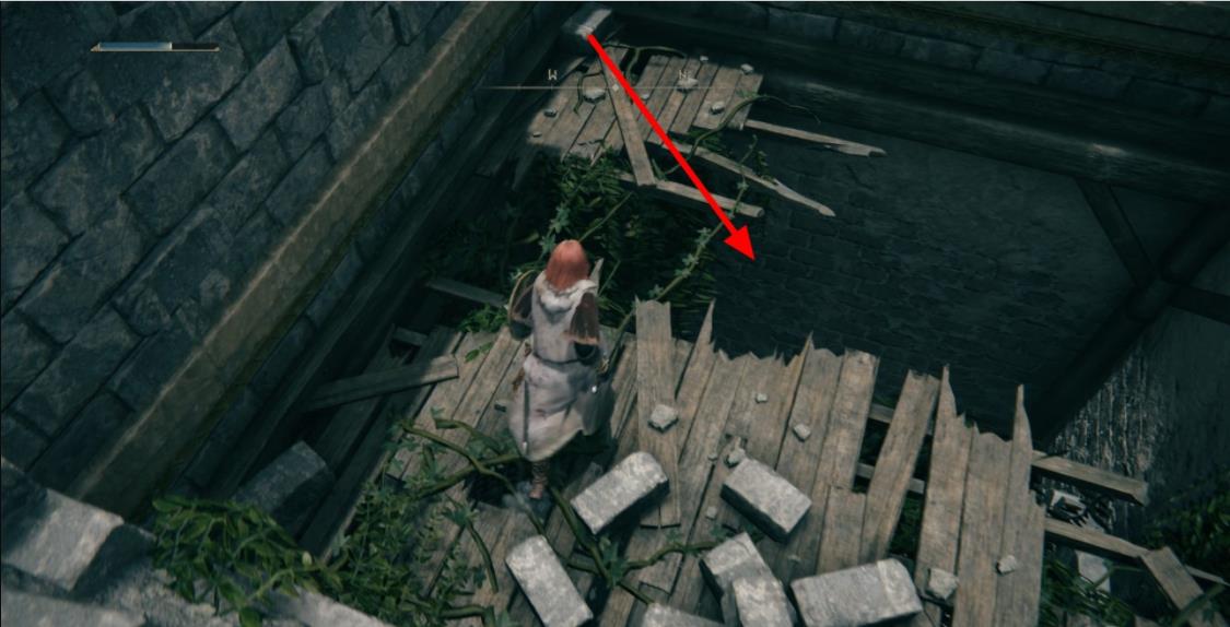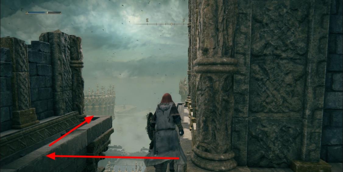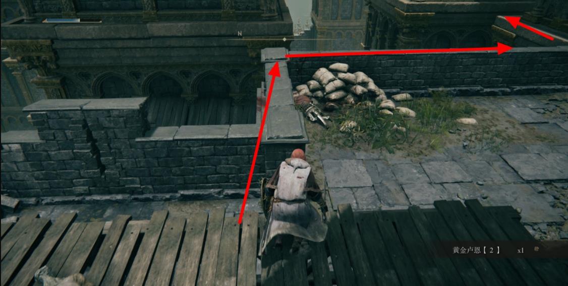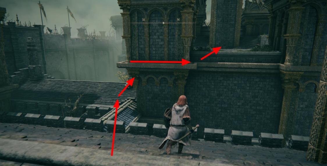 随后通过旁边的走廊屋顶到达对面,后通过倒下的碎石抵达上层平台边缘,沿着边缘前进抵达屋顶区域。