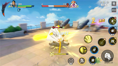 2.除此之外,黄猿还有1技能蓄力格挡的操作玩法,实战中遇到需要近身的攻击时,可蓄力格挡,然后反击敌人,接着再搭配2技能升级操作进行输出。