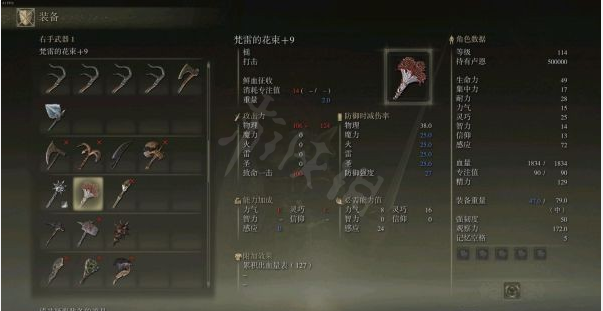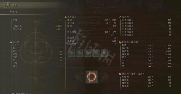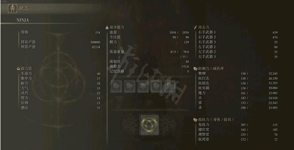 主要偏向血量与感应属性,图为最终通关属性(带大卢恩)。