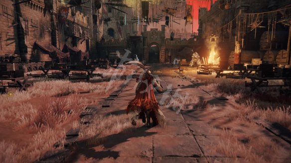 进城后往北走,过一个拱门时右手边有个赐福点,激活后继续往前走来到一个摆有很多条桌椅的场景。