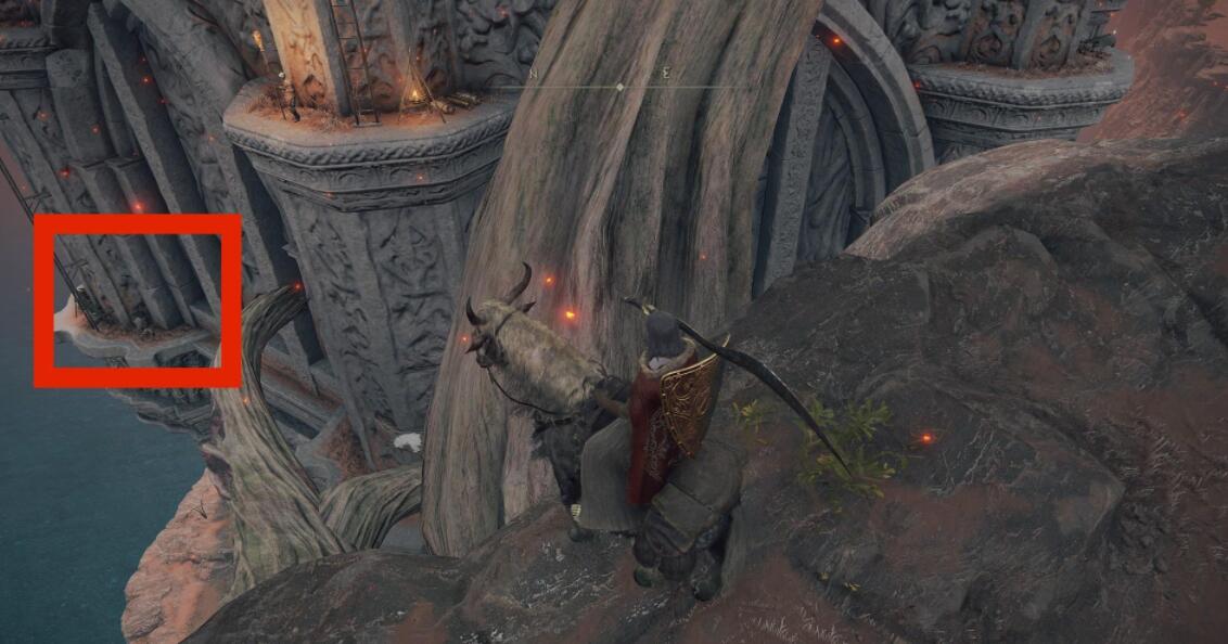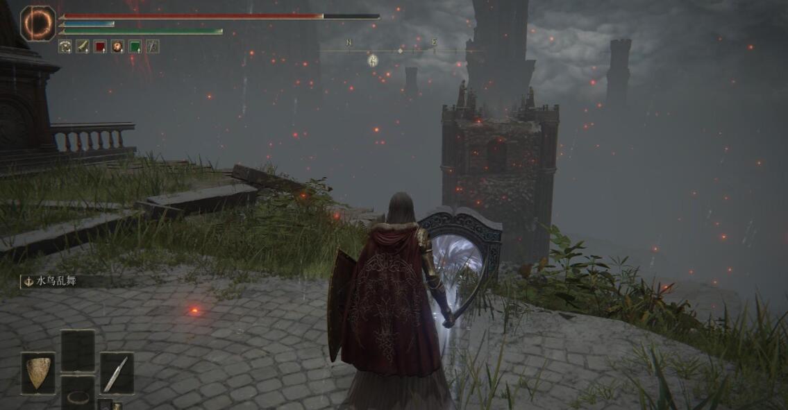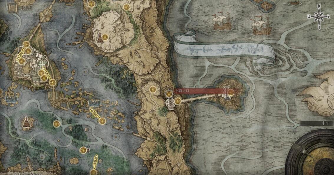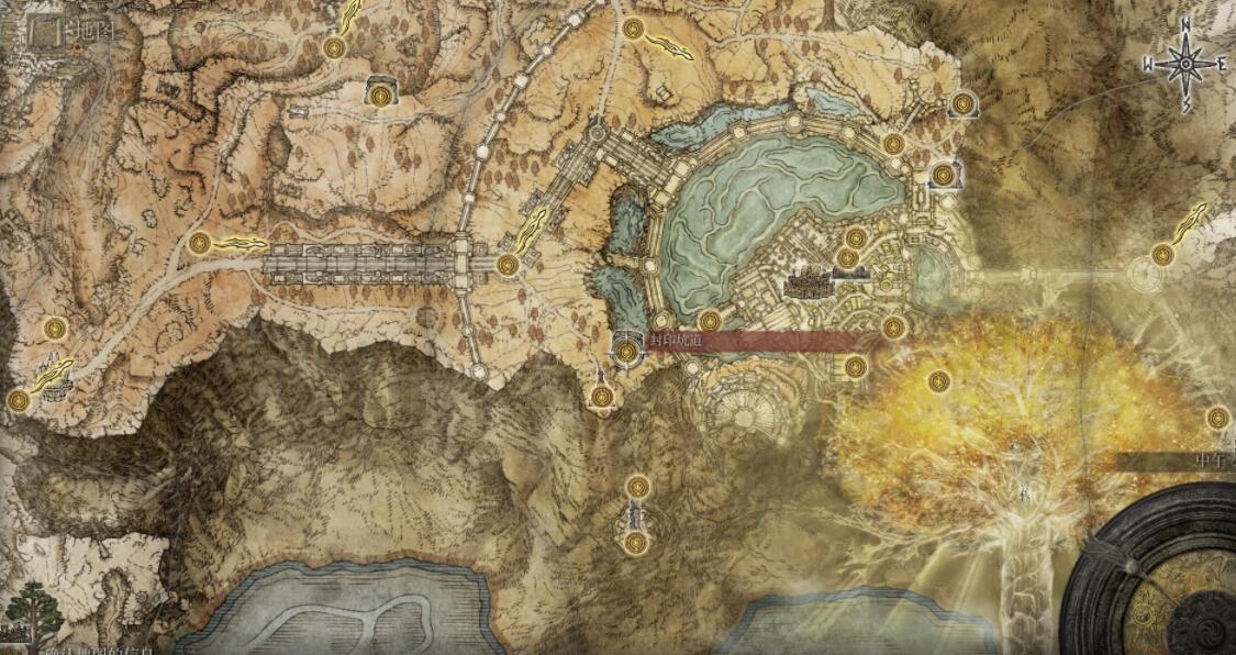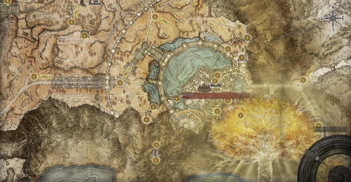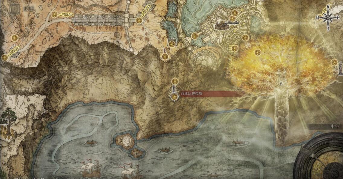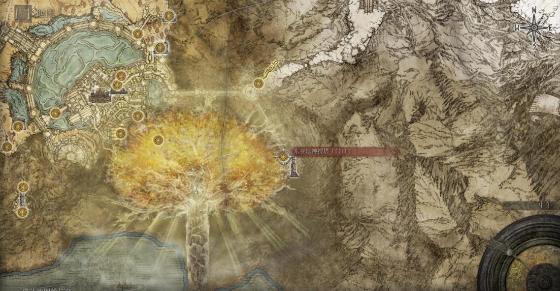 她坐落在黄金树的东边,具体位置如图1。进入神授塔要从【禁域】出发,坐升降梯到桥上后会出发双肥宅boss,将其击败后到达神授塔。