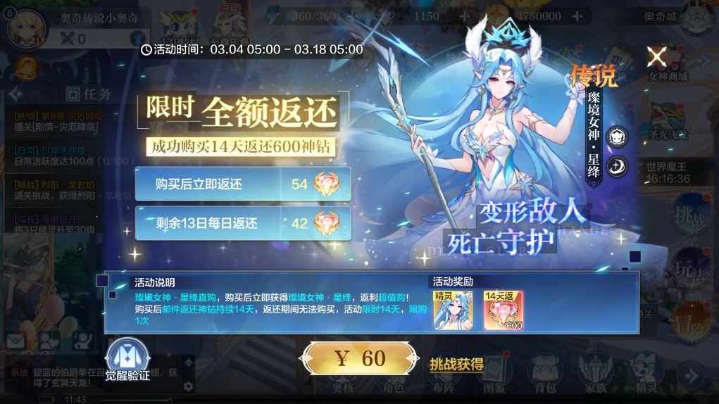 礼包内容(60元):1级璨境女神·星绛*1+神钻*600(分为14天返还)