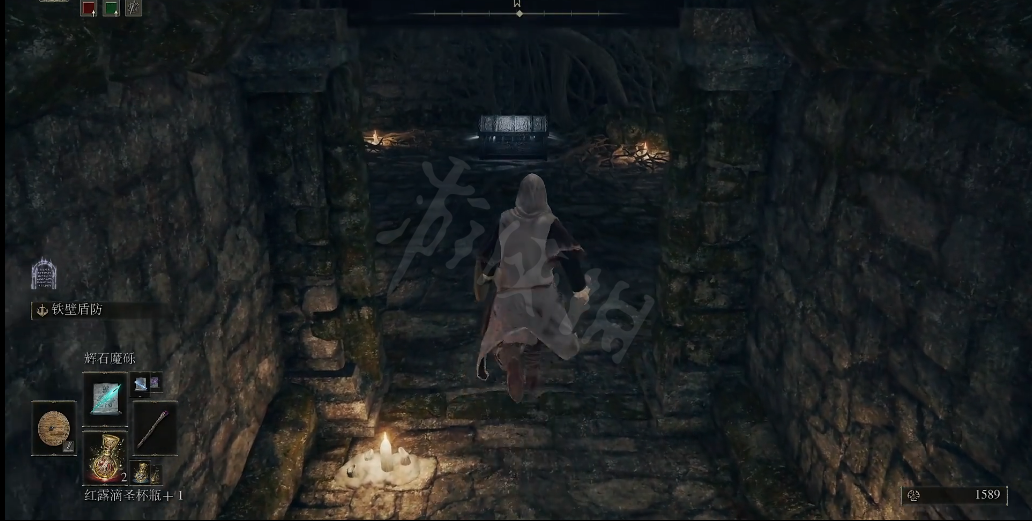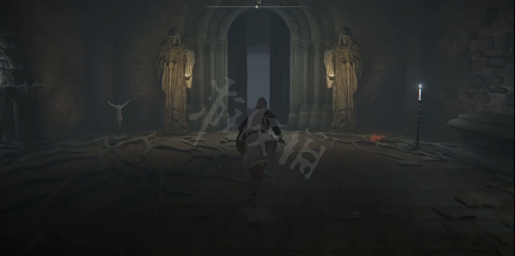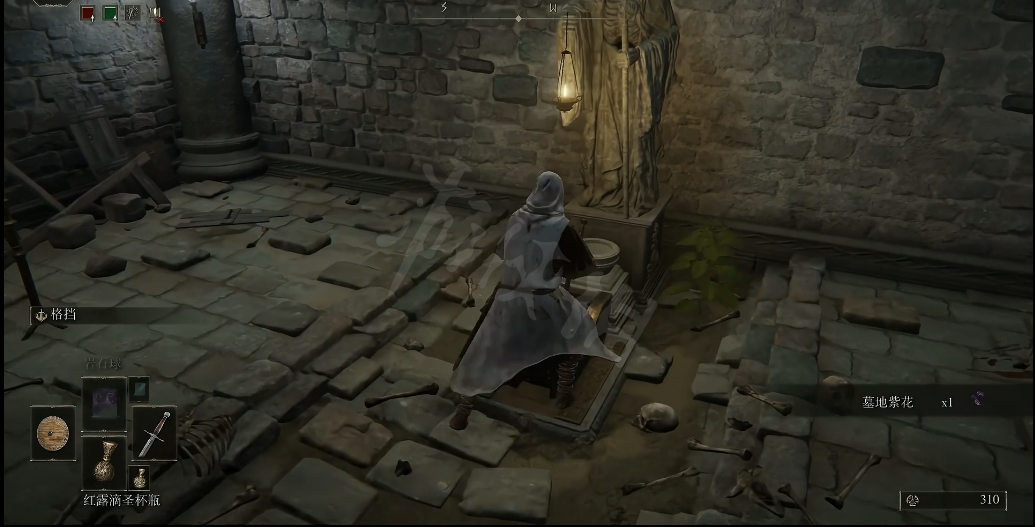 首先我们先来到地下墓地的右上角就是我现在光标所在的位置,前往光柱所在位置,有一具尸体,骑枪护符就在尸体上,骑枪护符起码可以增加10点攻击力。