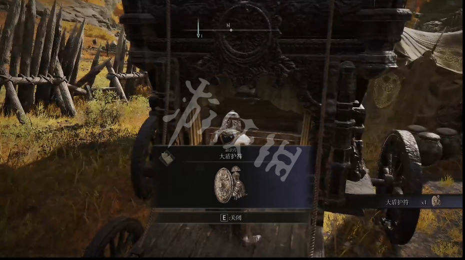 获取方法:来到近黄金树的山丘的东南方后,在马车后方的宝箱中存放着大盾护符。