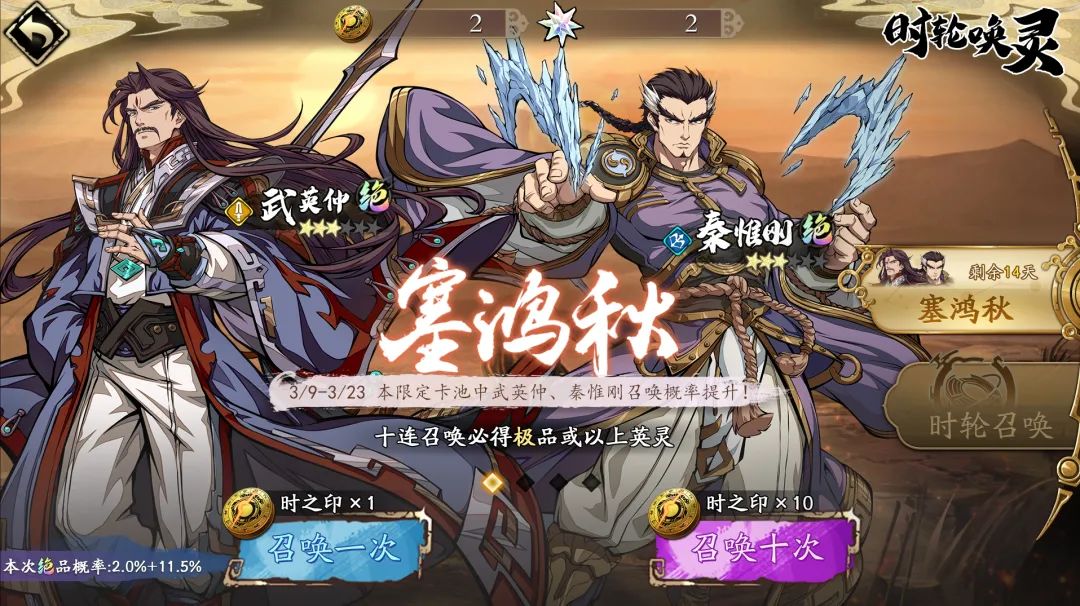 限定召唤「塞鸿秋」开启,绝品英灵武英仲&绝品英灵秦惟刚召唤概率提升