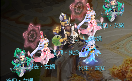 左二灵符女娲:升水击(强力单体法术攻击,击杀会触发法术追击,具有玄法法术抗性)