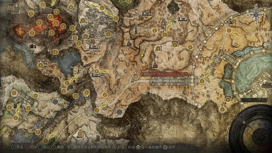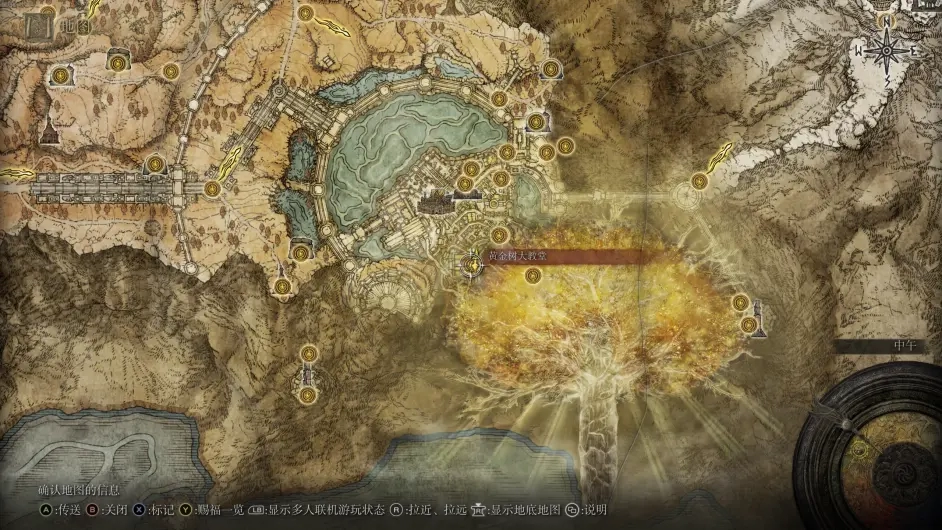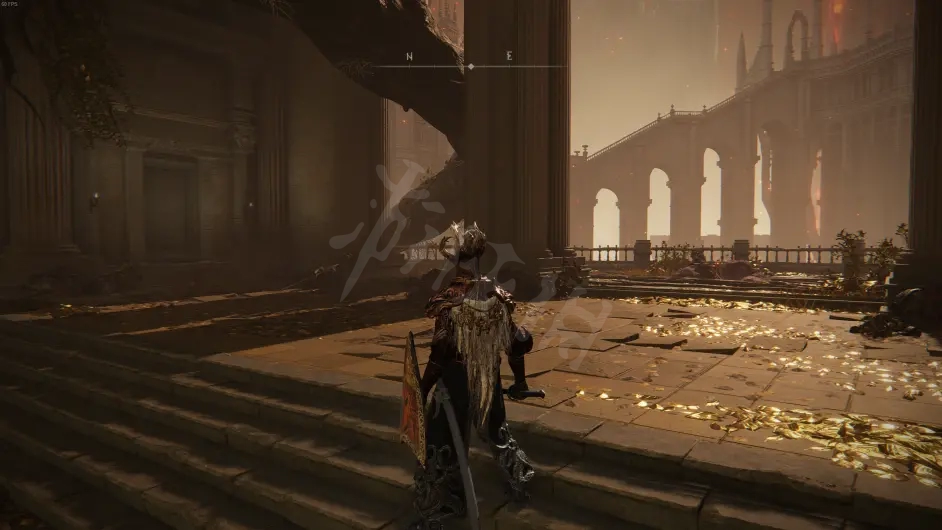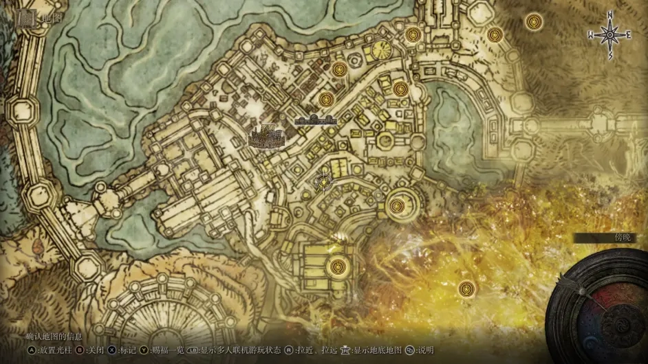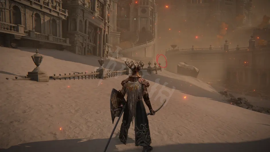 这里见过他们之后就可以放心烧树了,在打败风暴城最终boss黑剑之后,王城会变为灰城,在这里就可以再次见到柯林,从标记的路口前进过桥,然后左转走一段就可以看到金面具和他的大卢恩了。