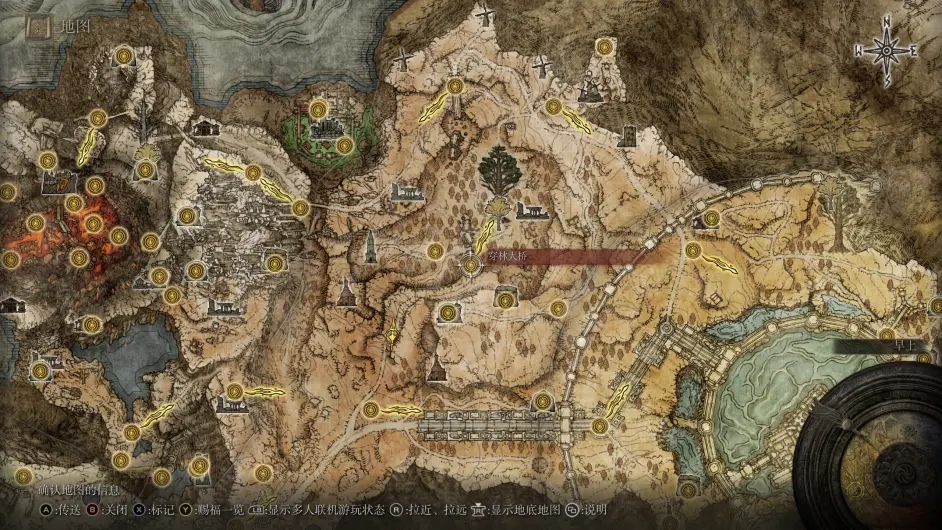 和他对话得知他在寻找金面具,金面具的位置就在穿林大桥的断桥对面,这里我们传送到穿林大桥赐福,乘坐旁边的传送门,再回头到断桥边就可以看到金面具了。
