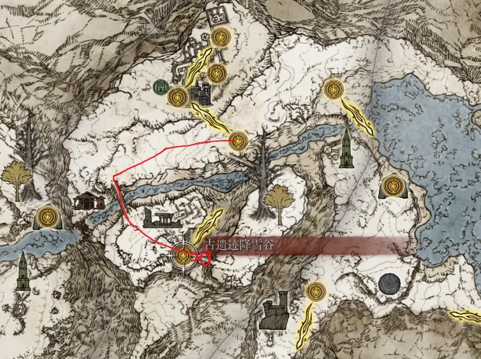 下一步在雪山,进行到这一步似乎烧树也可以,不过最好还是在烧树之前完成。在古遗迹降雪谷赐福的上方桥梁上可以再次看到他们。注意这里直接传送到古遗迹降雪谷是过不去的,需要从上面绕一圈。