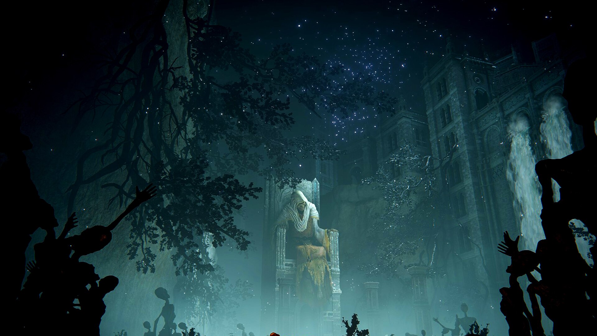 圣树的传送点祈祷室,出门一直沿着路走然后往下走,就可以看到有个没有围栏的边缘,跳到上面,再跳过去可以看到一个开着的门和里面有个被守着的宝箱就是这个骨灰。