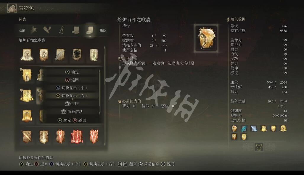 熔炉百相之喉囊:远古黄金树的其中一种祷告。能形成巨大喉囊,一边走动一边喷出火焰吐息。借由蓄力能延长喷出吐息的事件。