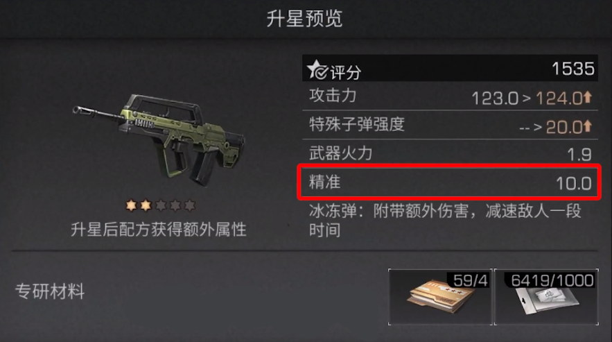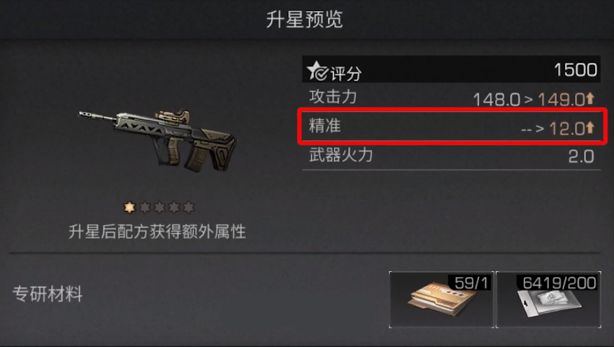 除了AUG突击步枪以外,其他步枪在配方专研到1星时,都可以获得10点精准值,而AUG突击步枪可获得12点精准值。因此在交易市场上其他步枪的最高精准值是30