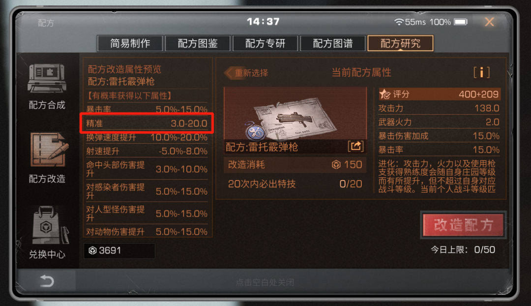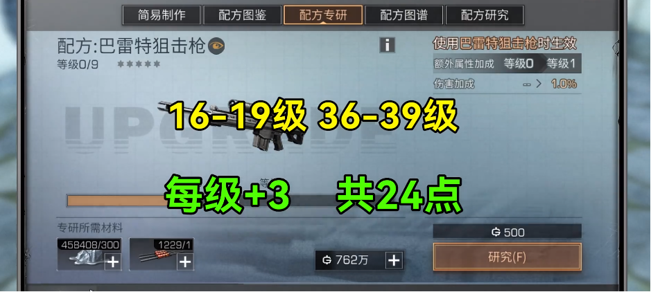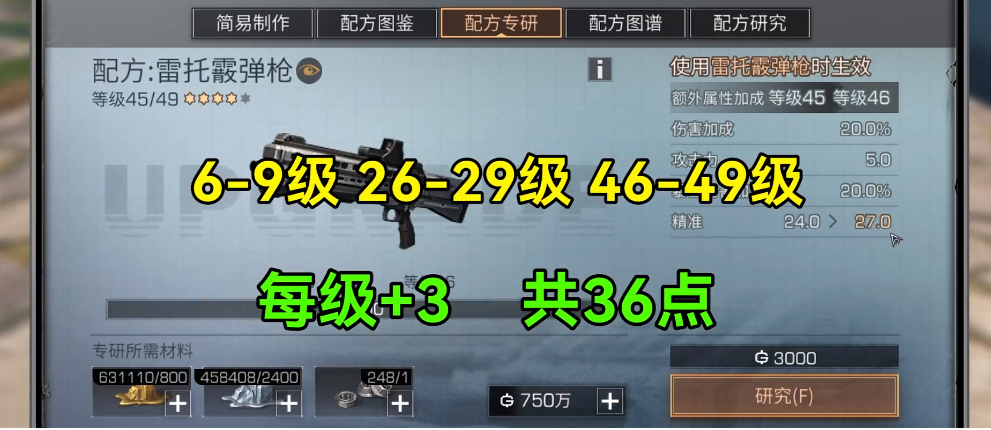 除了可以购买精准值较高的步枪外,幸存者还可以通过专研配方来提高精准值在步枪专研到6-9级、16-19级、26-29级、36-39级、46-49级时都可提高1点精准总共20点。