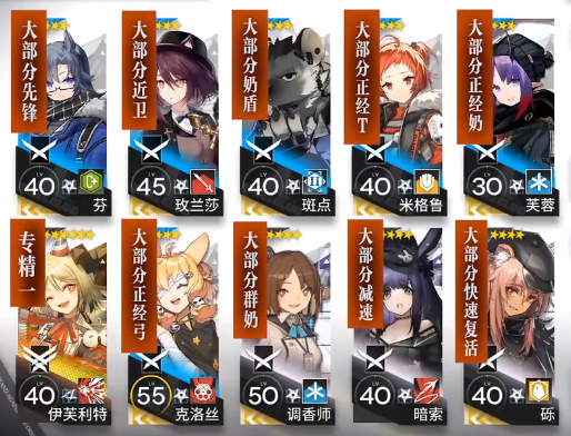 需求干员:先锋、近卫、单狙、奶盾、重装、群奶、单奶、拖拽控制、快速复活