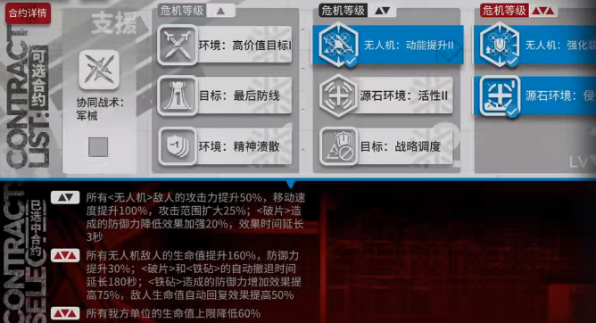 【无人机:动能提升 II】:所有<无人机>敌人的攻击力提升50%,移动速度提升100%,攻击范围扩大25%;<破片>造成的防御力降低效果加强20%,效果时间延长3秒。