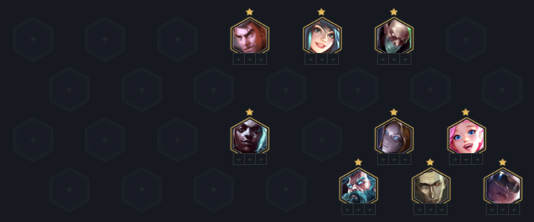 阵容整体思路依旧是前期3发明打工,只要海克斯前期不选特备弱的,基本稳赢外面,除了前期拿2费小组的狗,然后就是按部就班补卡即可,3发明基础上补精密/挑战/名流/刺客都是非常有角度的,目的就是混到7人口即可,每个人口要保证有对应的质量即可,2/3费2星一定要有的。