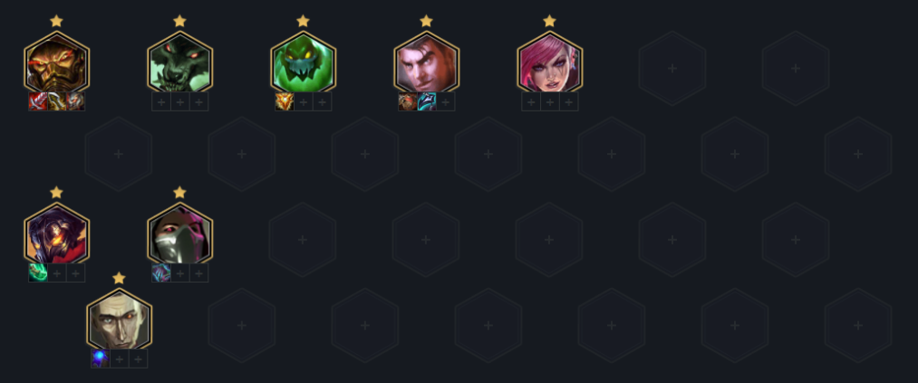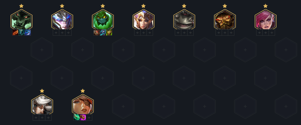 到了8级没希尔科,杰斯前可以先上猪妹+塔姆凑4格斗,根据转职可以考虑开7炼金、4挑战、4格斗等。