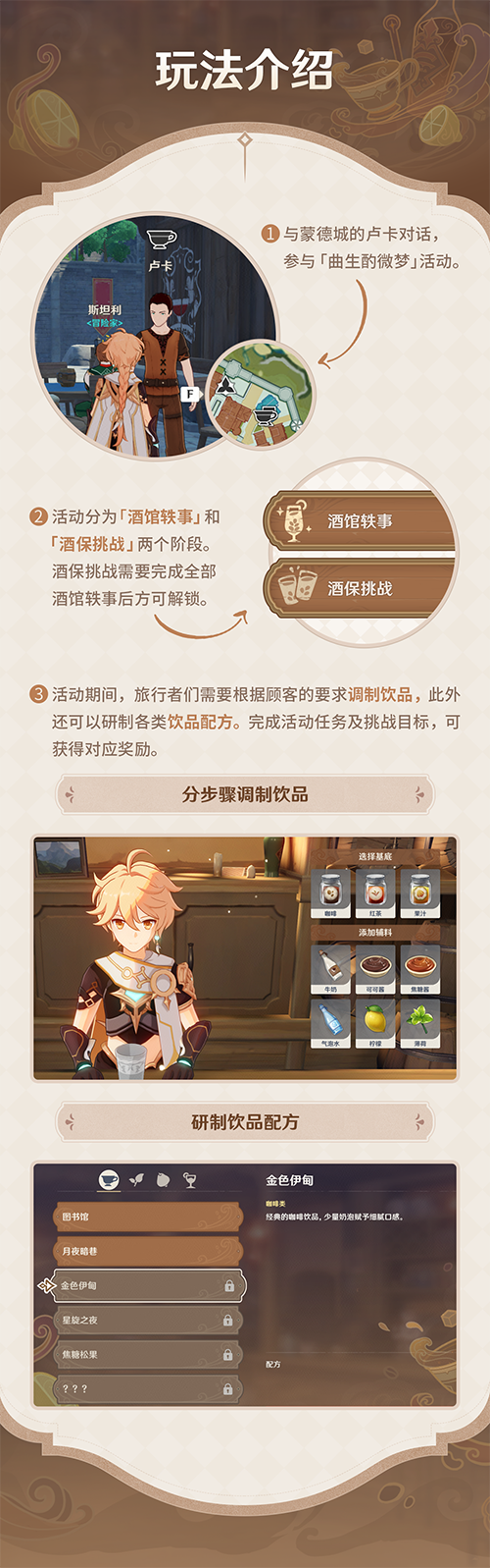 酒馆【天使的馈赠】最近似乎悄悄举行了活动,各位旅行者不妨一起去看一看,听听酒馆的诙谐轶事,再当一次酒保为来来去去的旅人献上一杯你特调的饮品吧!《原神》新活动【曲生酌微梦】上线,一起来解锁事件,获得奖励吧!