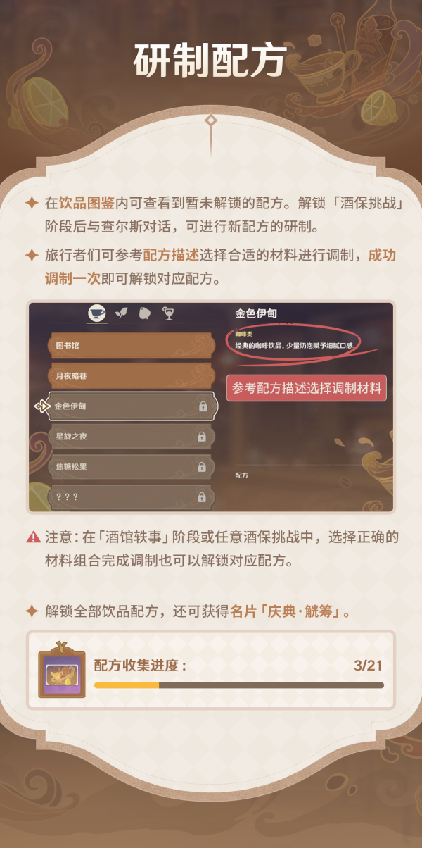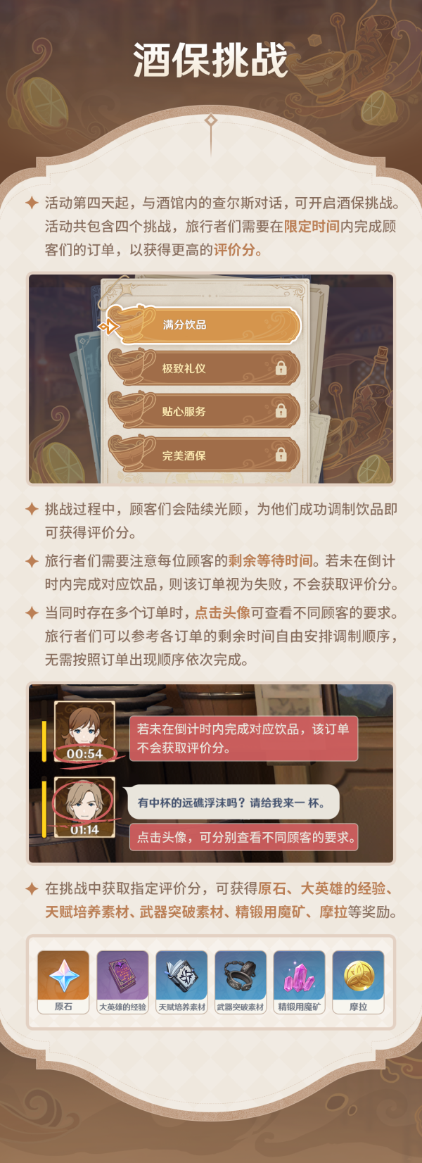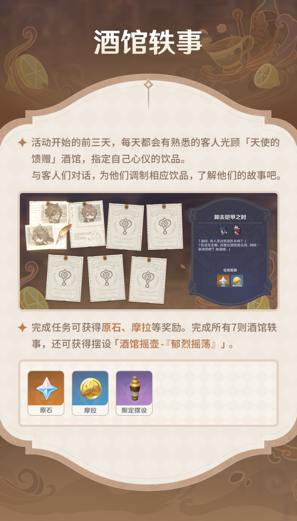 酒馆【天使的馈赠】最近似乎悄悄举行了活动,各位旅行者不妨一起去看一看,听听酒馆的诙谐轶事,再当一次酒保为来来去去的旅人献上一杯你特调的饮品吧!《原神》新活动【曲