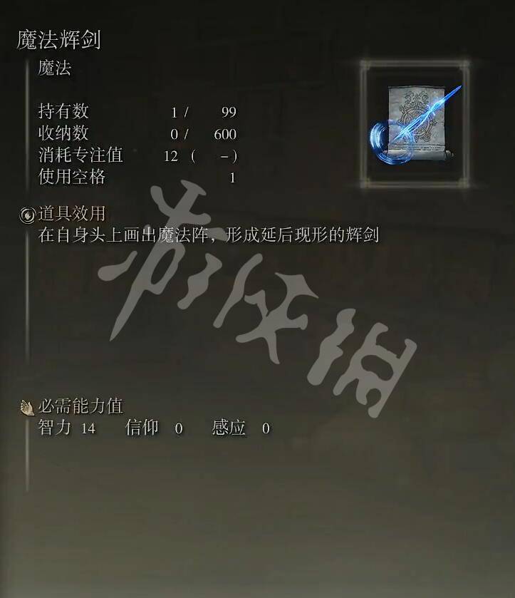 需要14智,消耗专注12,较高的伤害,效果是头顶画个圆圈,会延时召唤一把飞剑刺向敌人,可以移动施法(走路骑马均可以移动释放,且可以背对侧对敌人释放,无方向要求,只需要锁定敌人),这就是前中后期打boss的核心技能之一,部分boss,比如大地图的小黄金树boss,比如主线的碎星将军,比如一些人形持盾精英人形boss,都可以用魔法辉剑虐杀。