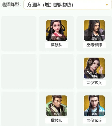 辅助鼓手选择上,小乔提供连续士气,孙权可增加计策攻击和三防(计策防御,物理防御,战法防御),让阵容整体输出和防御都得到加强。