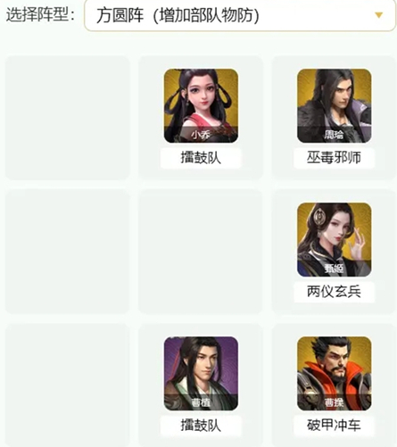 辅助鼓手选择上,小乔提供连续士气,孙权可增加计策攻击和三防(计策防御,物理防御,战法防御),让阵容整体输出和防御都得到加强。