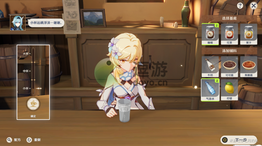 咖啡x2、气泡水x2、小杯(听派蒙的,往咖啡里多兑点水)