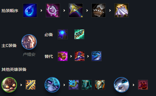 卢锡安作为阵容核心C位,因其技能伤害高还能躲技能,搭配上蓝BUFF让其释放多次技能打出高额伤害,再搭配上科技枪给团队增加续航,最后搭配法爆,大帽,巨杀等输出装让其最大化输出。