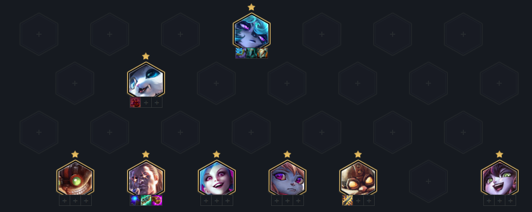 7级固定搭配6约2枪手2黑魔,8级可根据情况来上小法,机器人,金克丝等