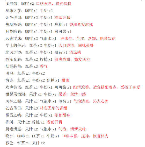 要......的咖啡/奶茶(奶茶是红茶+牛奶),红茶/果汁。这就需要据此确定基本配方,再根据其他要求进行添加。如口感强烈的咖啡:图书馆。