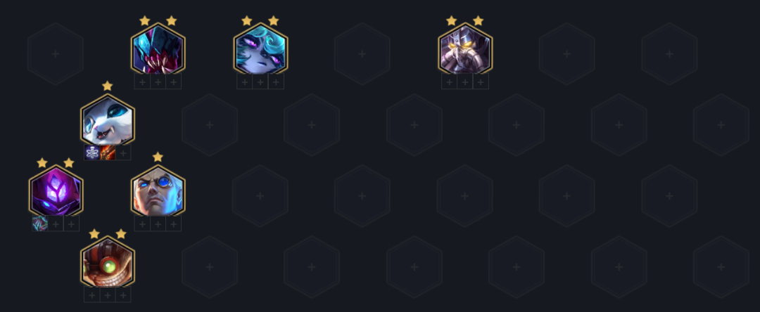 三阶段的3-2升六大搜找阵容,玛尔扎哈来的早就开3变异2黑魔2学者,有变异转可以给纳尔、卢锡安、赛娜打工,看来牌补充其他质量单牌和羁绊,科加斯占人口不上,给玛尔扎哈找鬼书稳血。