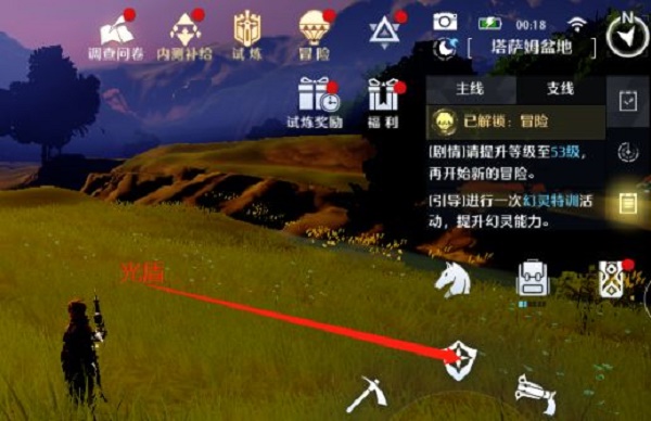 3.而隐匿宝箱就需要我们找工具了,是什么工具呢,就是光盾,我们在打世界探索时,使用光盾它会提示附近最近的宝箱,黑方石和风景秘境,我们跟着光标指示就可以找到;