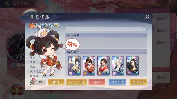 5.花团锦簇:活动期间,少侠可以在其它玩家的个人信息界面中,将通过完成曲水流觞活跃任务获得的蔷薇赠与好友,赠花同时可获得兑换道具柳枝。
