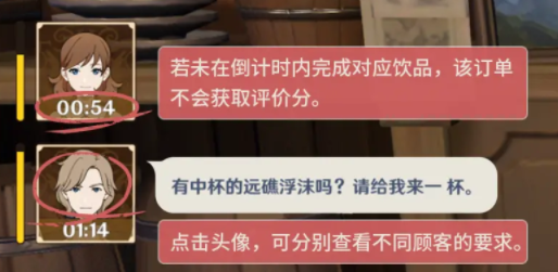 当同时存在多个订单时,点击头像可查看不同顾客的要求。旅行者们可以参考各订单的剩余时间自由安排调制顺序,无需按照订单出现顺序依次完成。