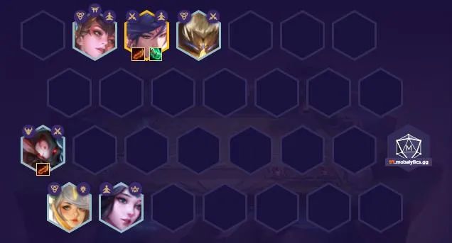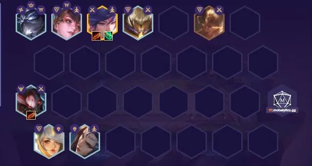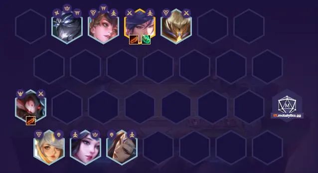 依靠中期剑姬的强势期,连胜速追人口,除了变阵找盲僧,不是很需要五费卡,上七之后如果搜到全阵容的牌就可以直接全金币速八,组成完全阵容,四玉剑四挑战剑姬即使被大削,三神装也足够在后期顶住,再慢慢搜高费二星提升质量。