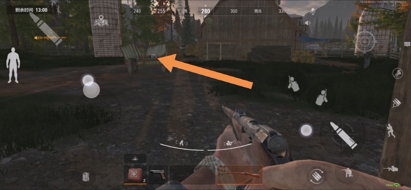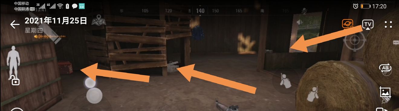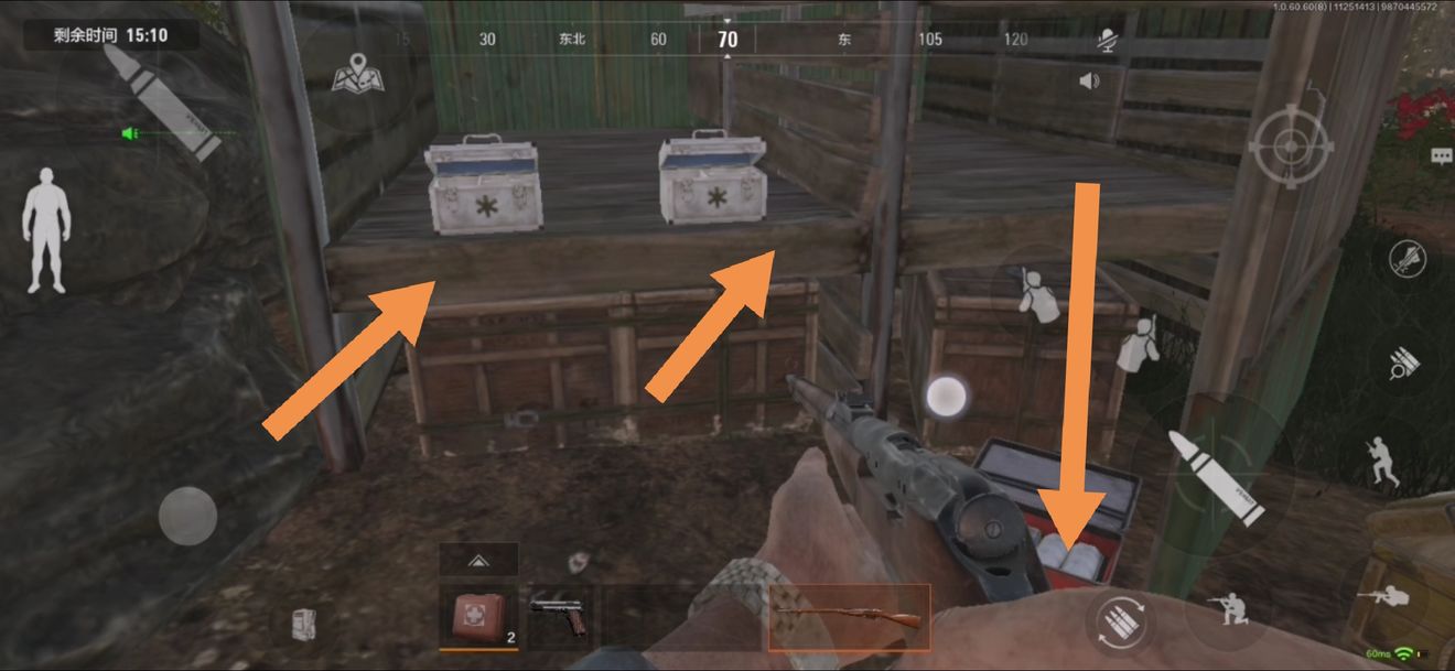 手雷箱在屋子里面而两人个医疗盒在屋子外面的架子上,有一个在地面。拿完之后可以跑去下面这个地方,不固定的有可能会有食物。