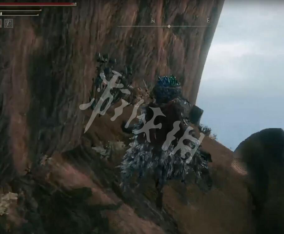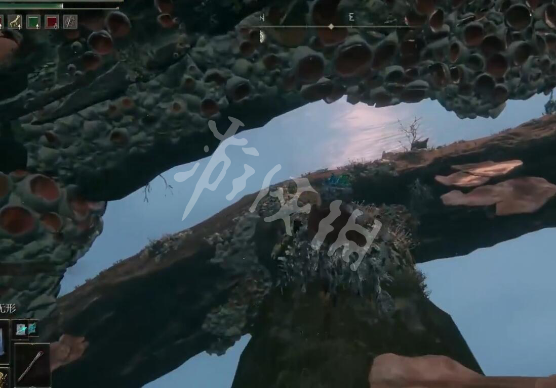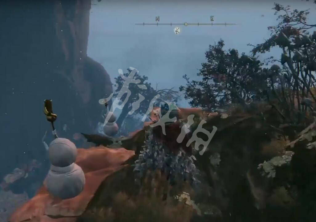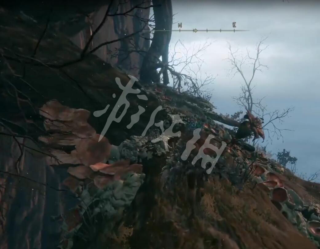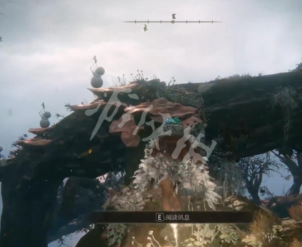 在下图的位置跳到下方的树枝上后继续向东北方向走。