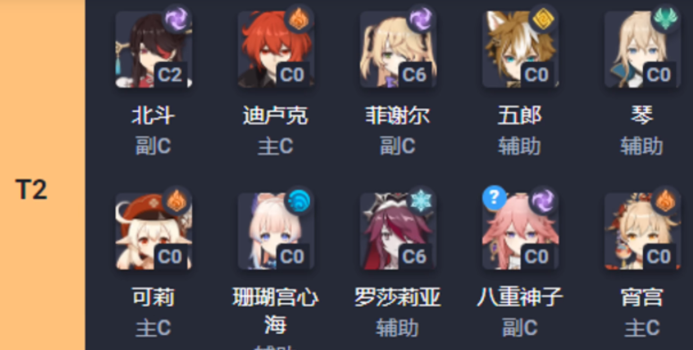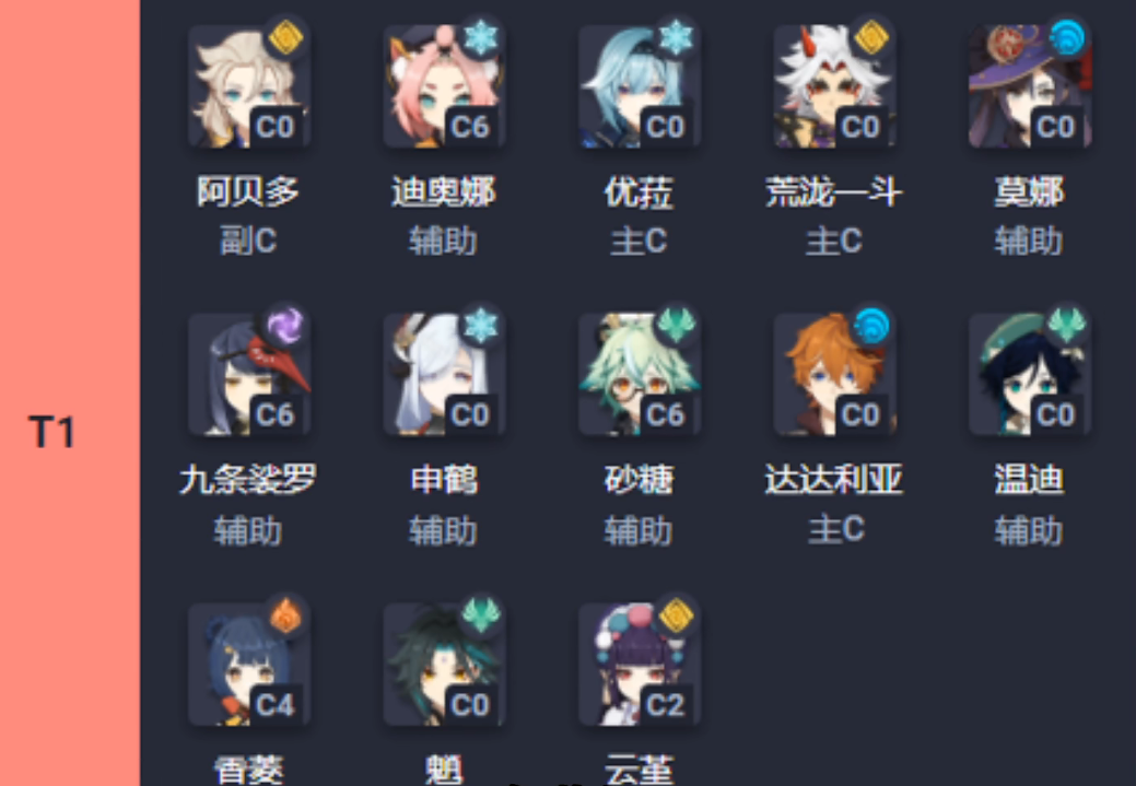 2、【T1】:雷电将军、申鹤、莫娜、迪奥娜、九条裟罗、五郎、云堇、砂糖、心海、温迪、琴