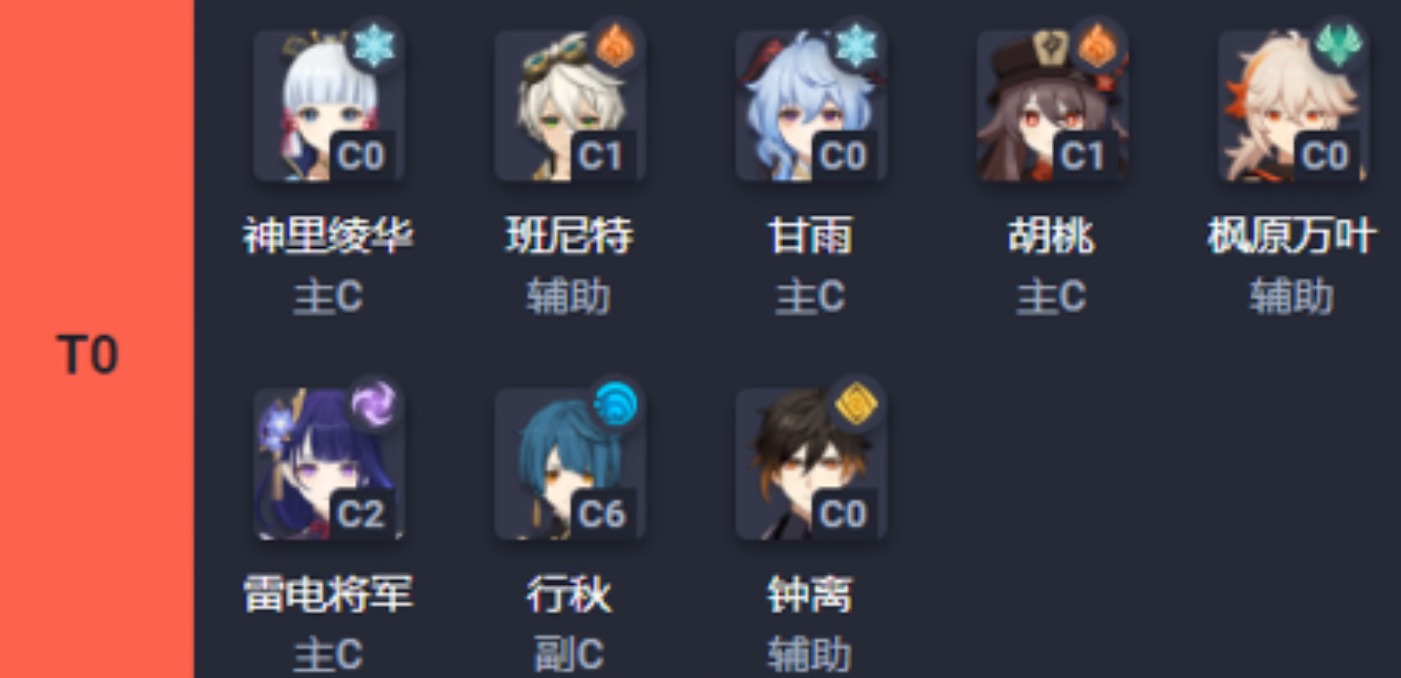 T0:胡桃、甘雨、神里绫华、雷电将军