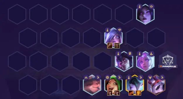 中期优势很大,但是后期输出有些乏力,测试局三阶段开始连胜直到六阶段,高血量满经济过度自信升了个九,结果翻车败给三星四费,图不上了,记住后期凭借优势去追三星四费,锐雯、烬都可,拉九单挂五费提升不大。