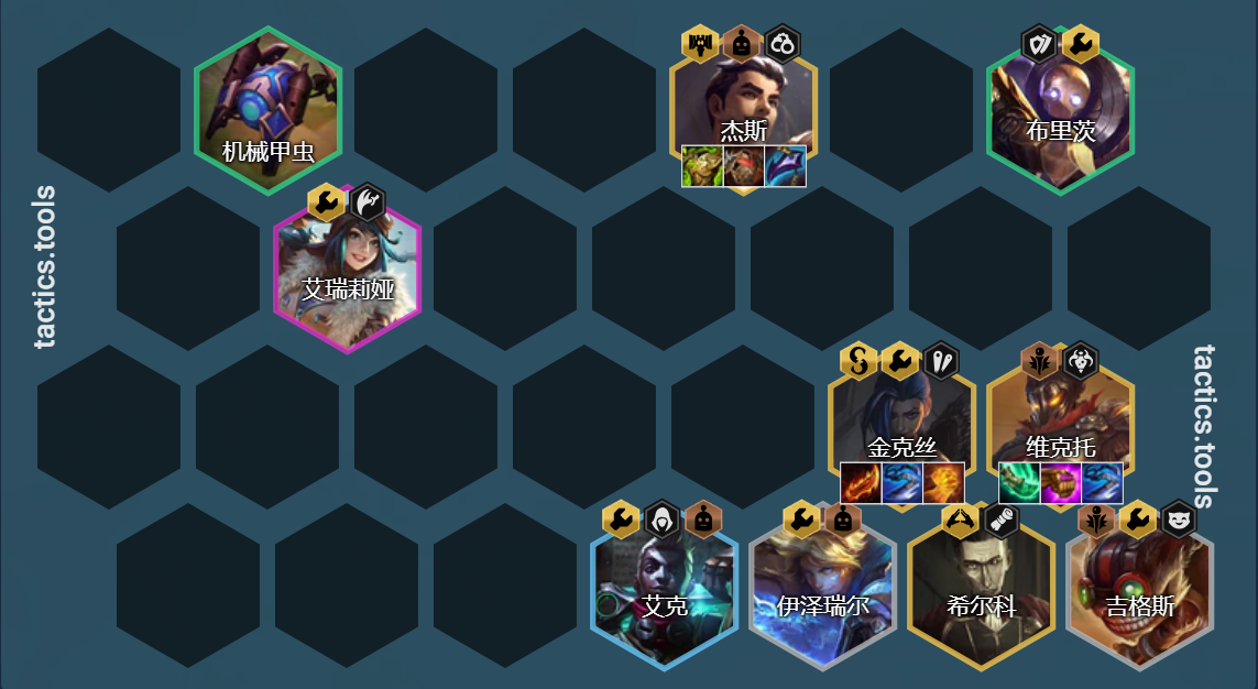 杰斯、布里茨、艾瑞莉娅、金克丝、维克托、艾克、伊泽瑞尔、希尔科、吉格斯