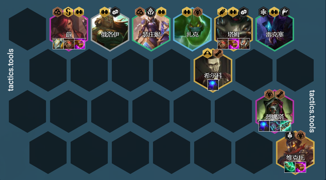 中期补充6黑魔羁绊能够增加阵容整体的伤害,后期只要有2星金克斯和维克托就可以收菜,而且如果有8黑魔羁绊的情况下,维克托和金克斯的伤害非常爆炸,因此这是一套非常强力的过渡阵容。