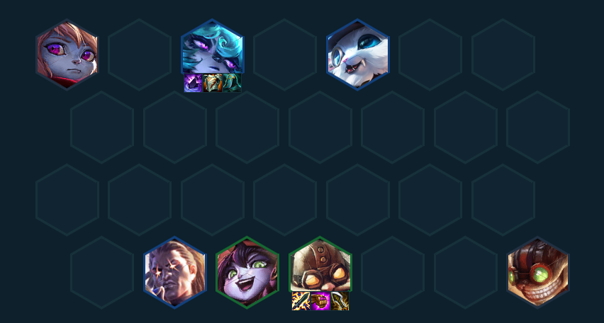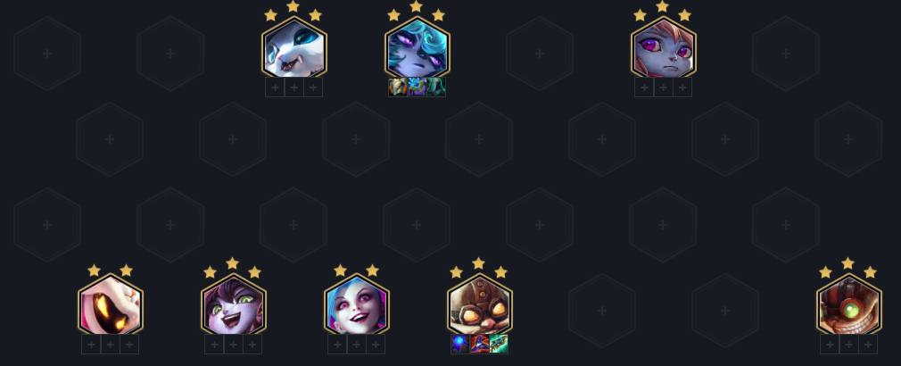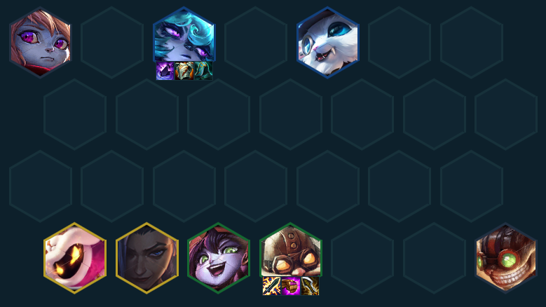 5-5左右拉八,挂上小法师,再搜出金克丝替换掉卢锡安,两张五费卡都二星后阵容就算完整成型了,站位C位沉底,璐璐站中间保双C,名流格子看情况让金克丝小法和薇古丝站。选秀优先找小法师和金克丝的装备,后期靠他们来提供主要输出。